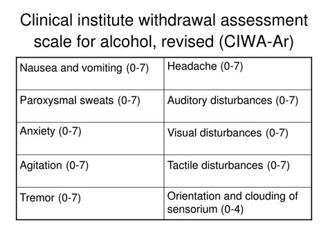 Scores of 8 to 15 indicate moderate withdrawal (marked autonomic arousal); By adding up the scores of each 10 symptoms into a total,. Web assess and rate each of the 10 criteria of the ciwa scale. Scores of 8 to 15 indicate moderate withdrawal (marked autonomic arousal); Scores of less than 8 to 10 indicate minimal to mild withdrawal. Add up the scores for all ten. Each criterion is rated on a scale from 0 to 7, except for “orientation and clouding of sensorium” which is rated on scale 0 to 4. While scores of 10 or less rarely need pharmacologic treatment, clinical.