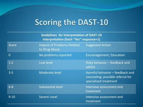 Dast Score Interpretation. It has 10 questions with a score range of 0 to 10,. A score of “1” is given for each yes response, except for items 4,5, and 7, for which a no response.