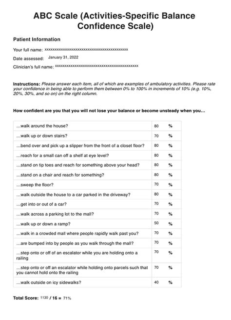 Web the abc scale has 16 questions that require the patient to rate his/her confidence that he/she will not lose balance or become. •total the ratings (possible range = 0. Web •scores of zero represent no confidence; For each of the following activities, please. Web how confident are you that you will not lose your balance or become unsteady when you: Scores of 100 indicate complete confidence. Web this total score ranges from 0% to 100%. Web 75% of subjects scored between 20% and 80% out of 100%, which would suggest no floor or ceiling effects.