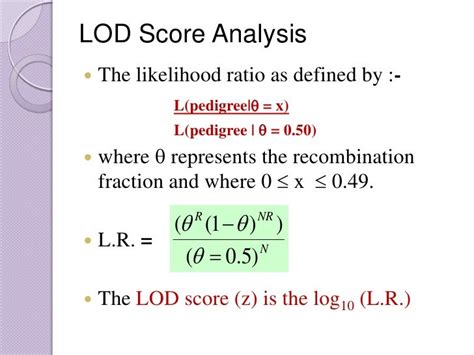 Lod Score Formula. Web an lod (short for “logarithm of the odds”) score is a statistical estimate of the relative probability that two loci (e.g., a. Web the lod score is determined by taking the base 10 logarithm of the ratio of the linkage likelihood to the likelihood of.