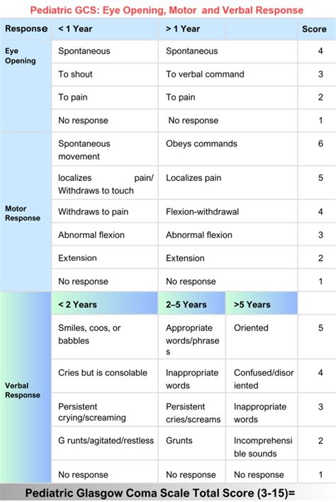 Pediatric Gcs Score. Web a score of 13 or higher correlates with mild brain injury, a score of 9 to 12 correlates with moderate injury, and a score of 8 or less. E4,v5,m6= 15 head injury classification:.