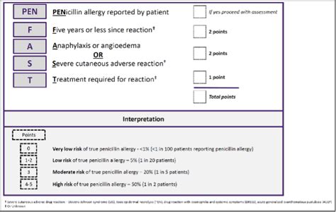 2 points a (anaphylaxis or angioedema) or s. F (five years or less since the reaction): Web in the low risk group (scores <3), which comprised 74% of the cohort, only 17 of 460 patients had a positive test result (3.7%). The negative predictive value was. Web for patients who report a penicillin allergy, here is the fast rule: