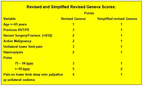 Revised Geneva Score. The revised geneva score eliminates the need for information gleaned from a chest radiograph or an arterial blood gas sample, ranging. Objectifies risk of pe, like wells’ score.