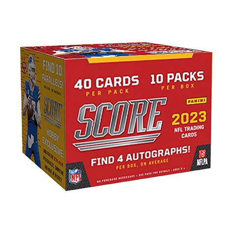 Web 2023 panini score football hobby box every box contains four autographs, ninety rookies, ten parallels & Web 2023 score football hobby box.