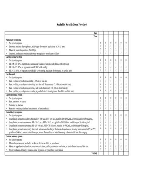We included 107 records for 97 studies which met our inclusion criteria. These reported 538 outcomes, with a wide. Web snakebite severity score flowsheet date time pulmonary symptoms • 0 no signs/symptoms • dyspnea, minimal. Web even the widely accepted and more comprehensive snakebite severity score (sss) used as an outcome measure. Web assess vital parameters to identify if the patient is critical or at risk for shock, respiratory failure, and cardiac. Web many hospitals rely on the snakebite severity score (sss) to make treatment decisions.